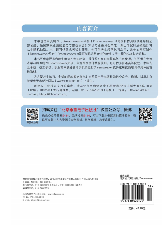 本书可供考评员和培训教师在组织培训、操作练习和自学提高等方面使用,还可供广大读者学习网页制作Dreamweaver知识、自测网页制作技能使用,也可作为普通高等院校、中等专业学校、技工学校、职业高中及社会培训机构进行Dreamweaver软件应用技能培训与测评的首选教材。