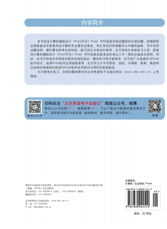 为方便考生练习,全部的题库素材还可在北京希望电子出版社网站(www.bhp.com.cn)上提供。需要本书或技术支持的读者,请与北京海淀区中关村大街22号中科大厦A座10层(邮编:100190)发行部联系,电话:010-82620818(总机),传真:010-62543892,E-mail:bhpjc@bhp.com.cn。