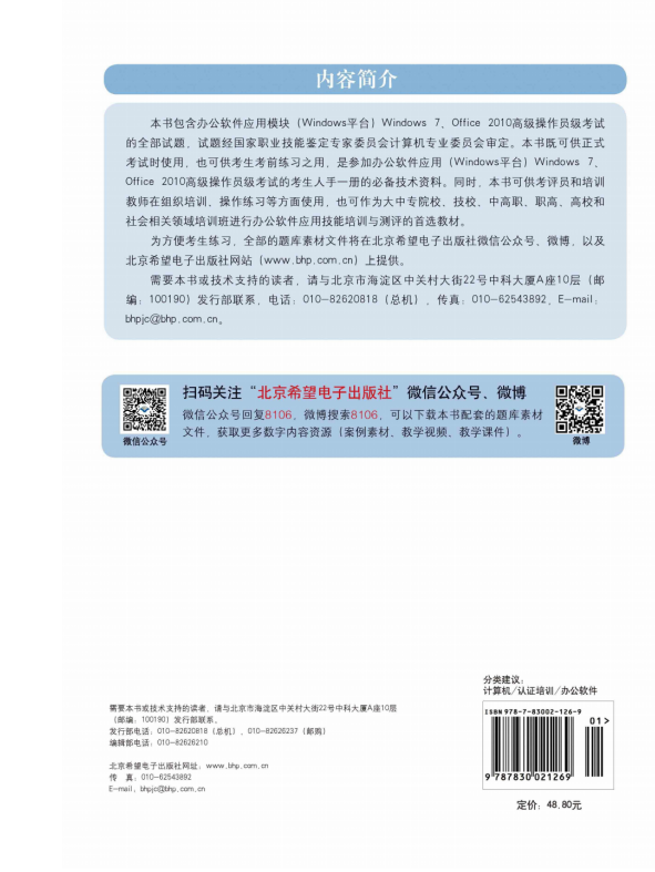 为方便考生练习,全部的题库素材文件将在北京希望电子出版社微信公众号、微博,以及北京希望电子出版社网站(www.bhp.com.cn)上提供。