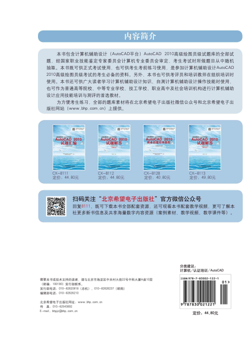本书可作为普通高等院校、中等专业学校、技工学校、职业高中及社会培训机构进行AutoCAD软件应用技能培训与测评的首选教材。