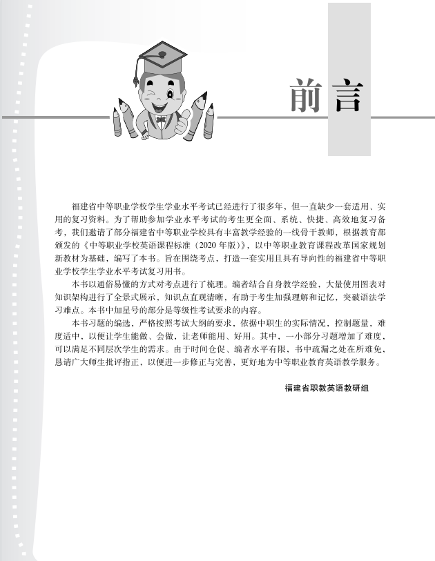福建省中等职业学校学生学业水平考试已经进行了很多年,但一直缺少一套适用、实用的复习资料。为了帮助参加学业水平考试的考生更全面、系统、快捷、高效地复习备考,我们邀请了部分福建省中等职业学校具有丰富教学经验的一线骨干教师,根据教育部颁发的《中等职业学校英语课程标准(2020年版)》,以中等职业教育课程改革国家规划新教材为基础,编写了本书。旨在围绕考点,打造一套实用且具有导向性的福建省中等职业学校学生学业水平考试复习用书。