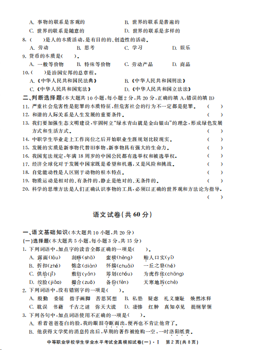 事政策教育、法律与职业教育、国家安全教育和就业创业创新教育等内容;语文部分: