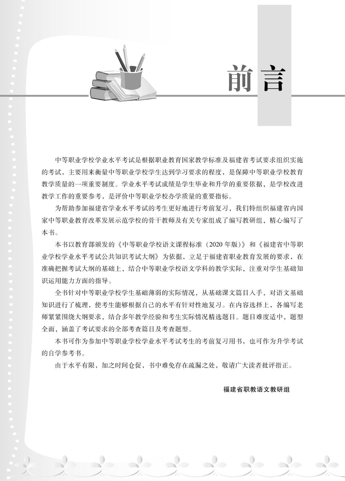 本书以教育部颁发的《中等职业学校语文课程标准(2020年版)》和《福建省中等职业学校学业水平考试公共知识考试大纲》为依据,立足于福建省职业教育发展的要求,在准确把握考试大纲的基础上,结合中等职业学校语文学科的教学实际,注重对学生基础知识运用能力方面的指导。