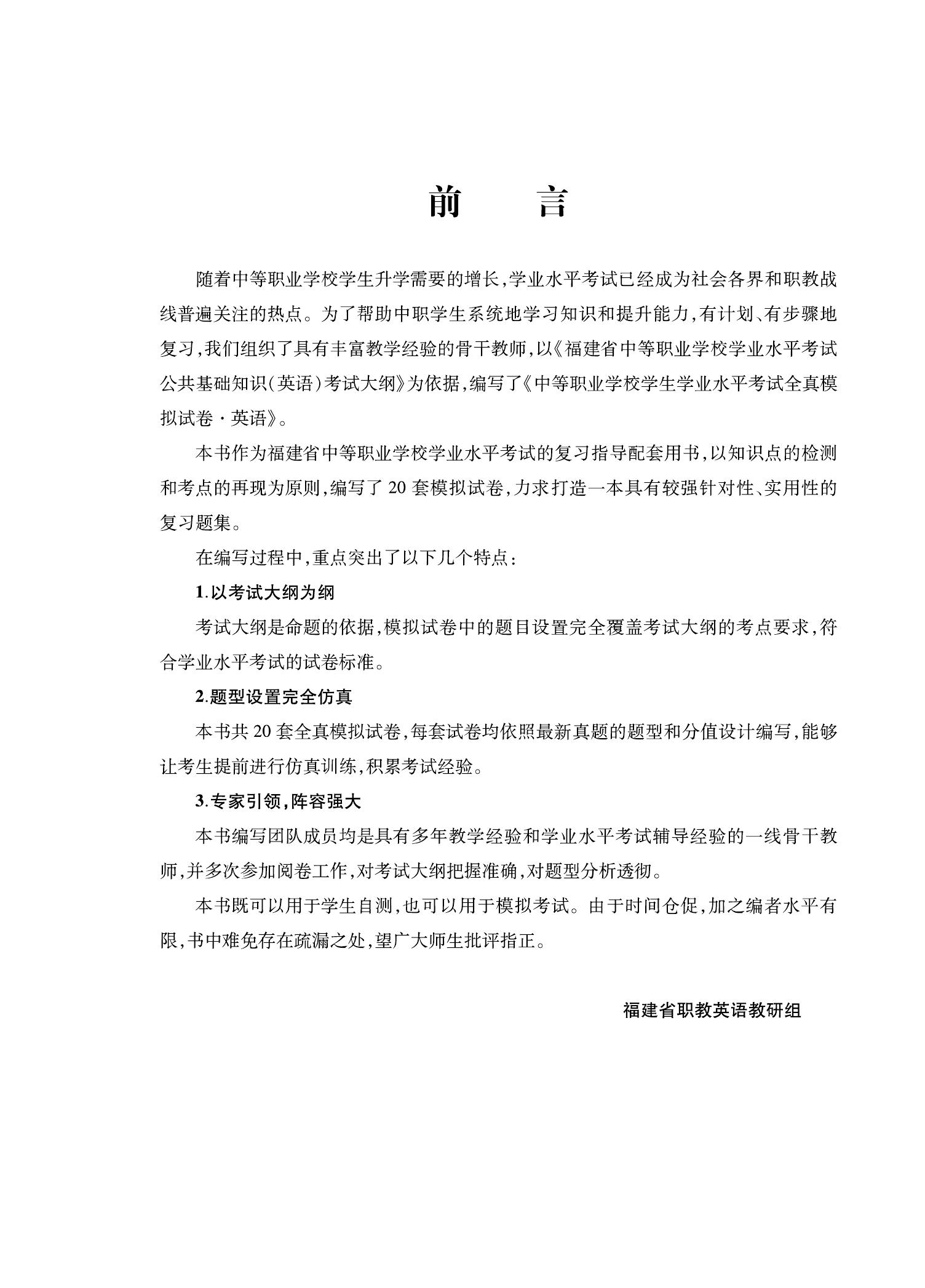 随着中等职业学校学生升学需要的增长,学业水平考试已经成为社会各界和职教战线普遍关注的热点。为了帮助中职学生系统地学习知识和提升能力,有计划、有步骤地复习,我们组织了具有丰富教学经验的骨干教师,以《福建省中等职业学校学业水平考试公共基础知识(英语)考试大纲》为依据,编写了《中等职业学校学生学业水平考试全真模拟试卷·英语》。