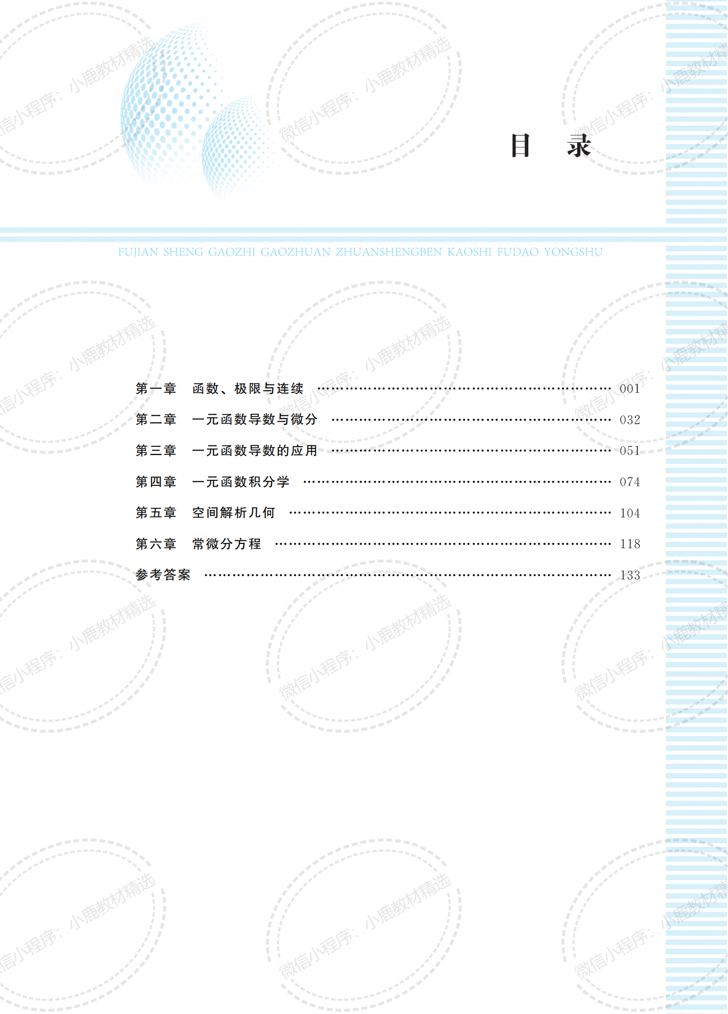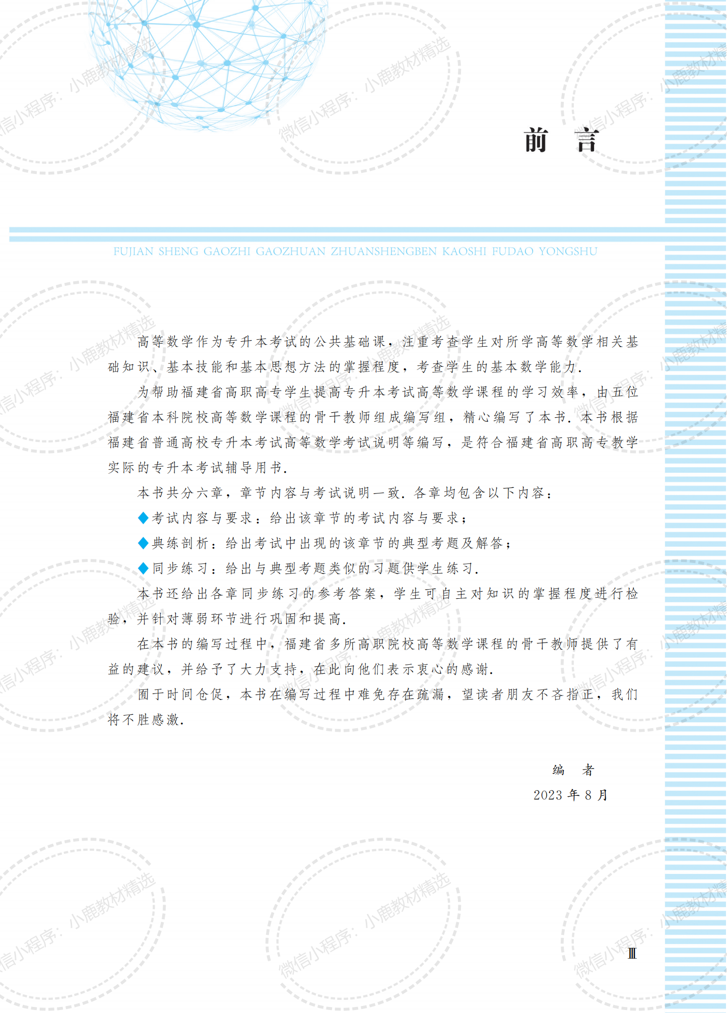 本书还给出各章同步练习的参考答案,学生可自主对知识的掌握程度进行检验,并针对薄弱环节进行巩固和提高.在本书的编写过程中,福建省多所高职院校高等数学课程的骨干教师提供了有益的建议,并给予了大力支持,在此向他们表示衷心的感谢.