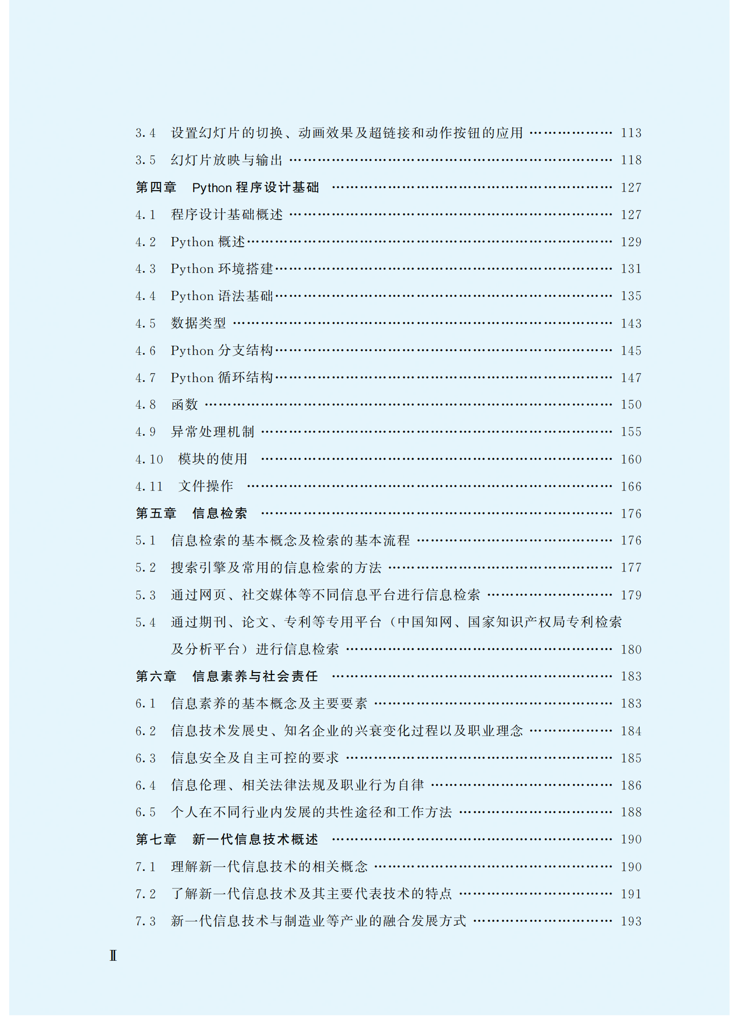 本书的编写围绕信息意识、计算思维、数字化创新与发展、信息社会责任四个方面的技能与能力展开,旨在让学生更好地理解和掌握信息技术的基本能力.本书共16章,内容分为文档处理、电子表格处理、演示文稿制作、Python程序设计基础、信息检索、信息素养与社会责任,以及一系列新一代信息技术的概述,如大数据、人工智能、云计算、现代通信技术、物联网、数字媒体、区块链等.我们希望通过这本书,让学生了解到信息技术发展的重要内容,理解并掌握利用信息技术解决各类问题的基本思想和方法.在每个单元的结尾,我们都提供了习题,方便学生进一步学习和巩固所学知识.